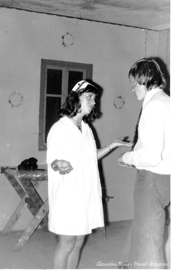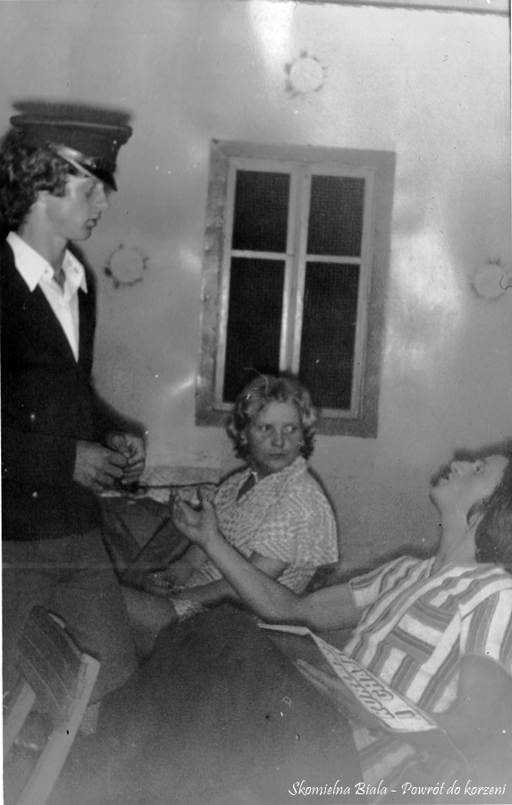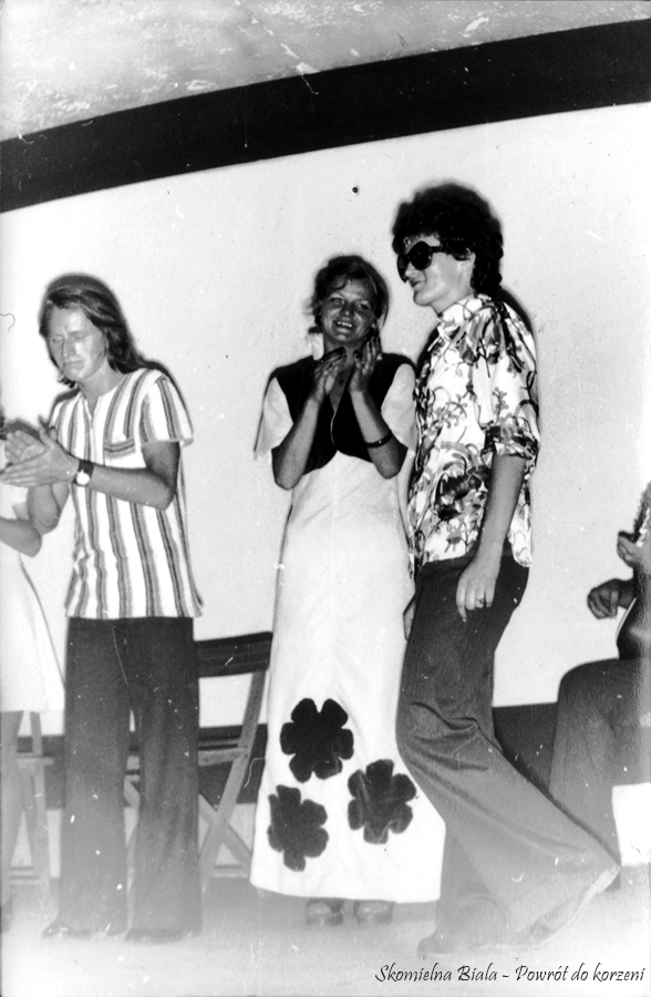 7. Podczas występu na scenie w utworze "Skomielna, Skomielna". 8. Podziękowanie widowni dla kabaretu. Na zdjęciu: Edward Gacek, Stanisława Biernat i Marta Madejowicz. 9. Skecz „Bilety do kontroli” - 1975. wystąpili: Czesiek Magiera – kontroler, Hania Gacek, Marysia Żur, Edek Gacek, Marek Mizera – pasażerowie.