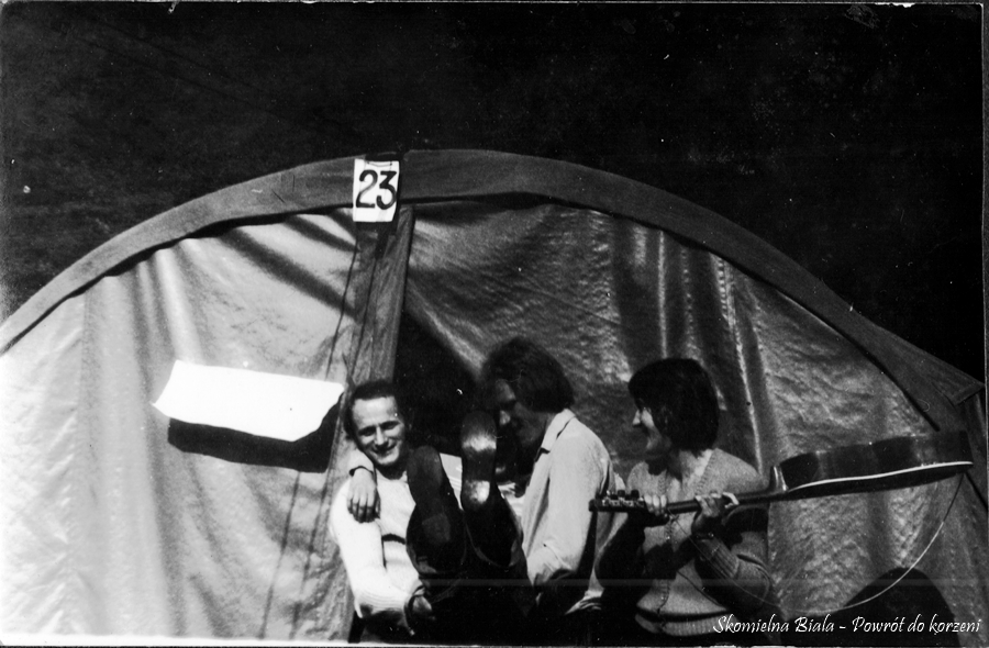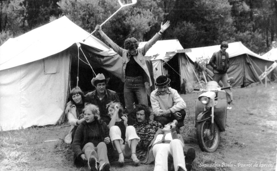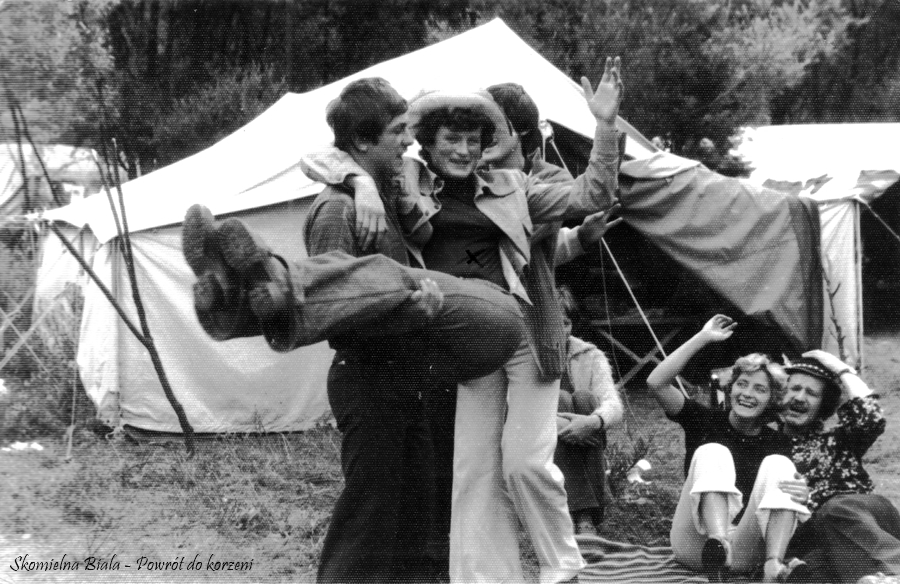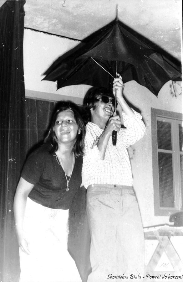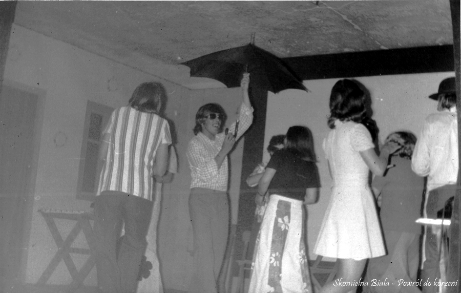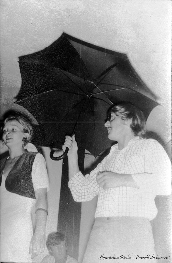 4. Utwór „Skomielna, Skomielna” - 1975. 5. Stoją od lewej: Czesiek Magiera, Marysia Żur, Marek Mizera, Hania Gacek, Edward Gacek, Kazimiera Kościelniak, Stasia Biernat, tyłem, pod parasolem, konferansjer – Władysław Żur. 6. Utwór „Skomielna, Skomielna” - 1975 r.