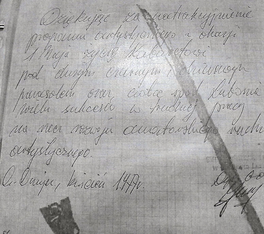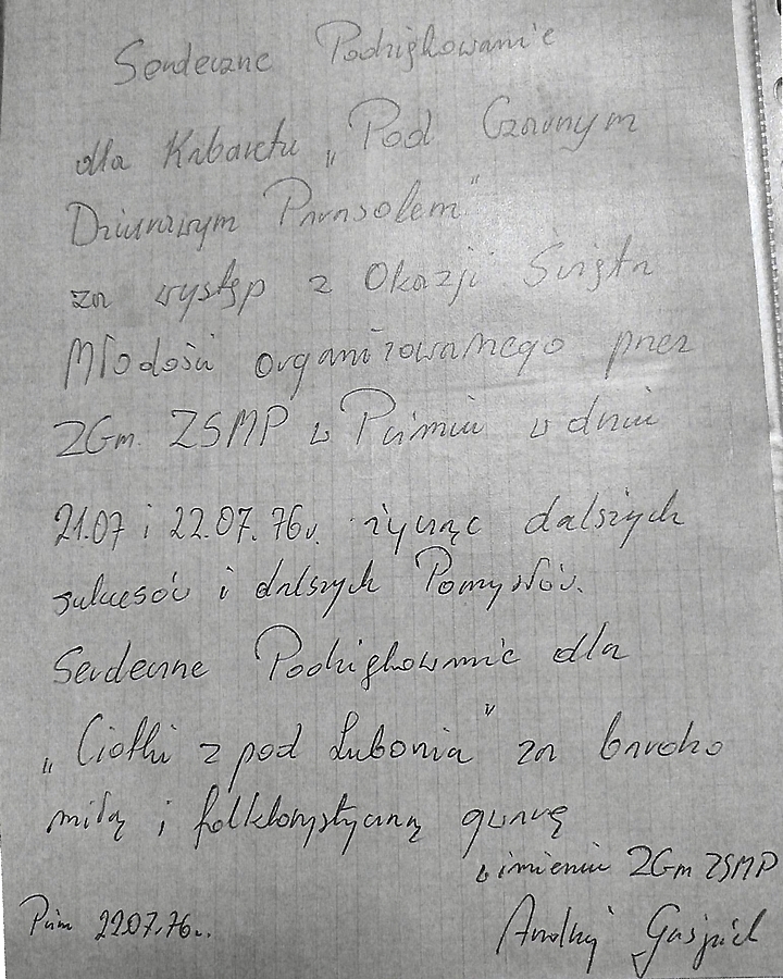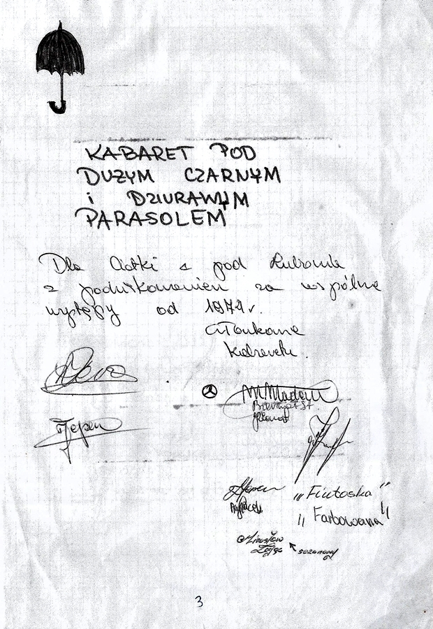 Tekst w oparciu o wspomnienia własne członka kabaretu „Pod Dużym, Czarnym i Dziurawym Parasolem” pana Marka Mizery, opracowała mgr Izabela Handzel, nauczyciel Zespołu Szkół Ogólnokształcących i Zawodowych w Lubniu. Skład, opracowanie graficzne, Zdzisław Kościelniak, członek kabaretu.